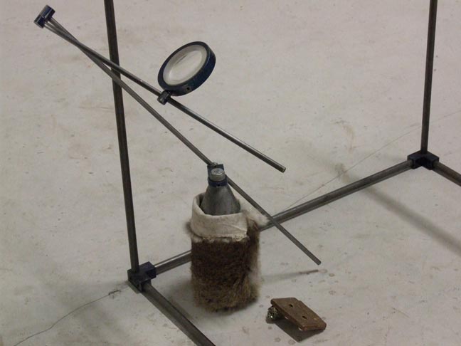 Machined steel, cast bronze, cast aluminum, Kentucky rabbit fur, plano-concave lens and Kentucky pyrite