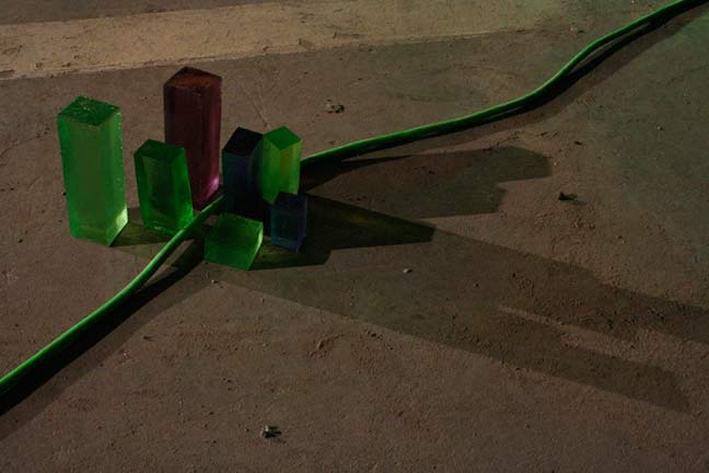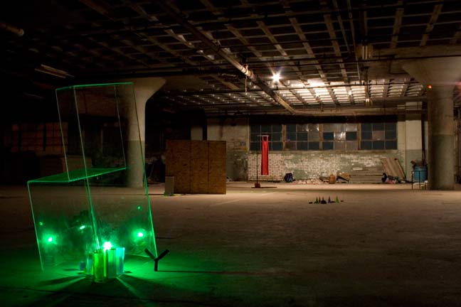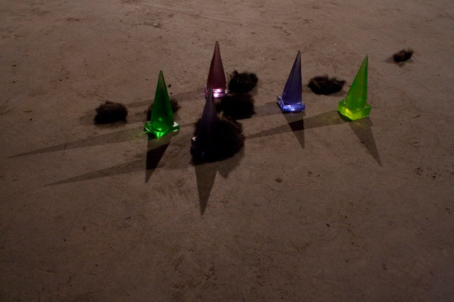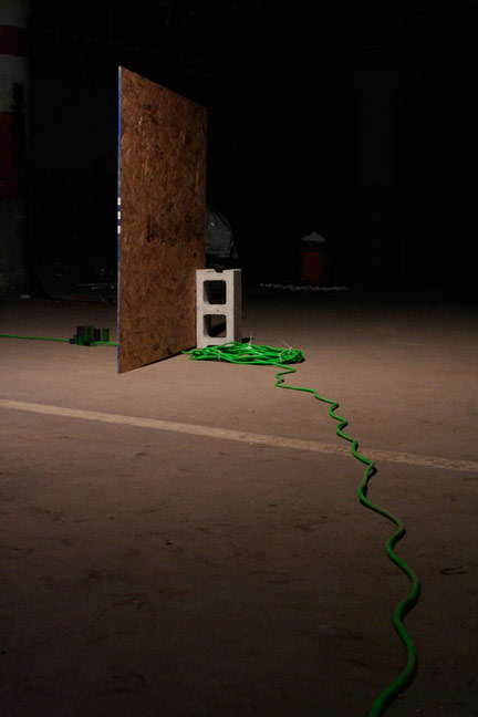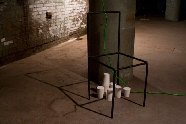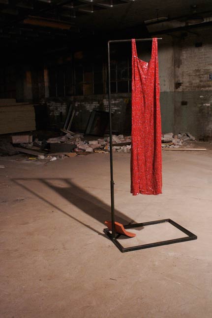 Steel, acrylic, cast resin, cast plaster, ply wood, two cinder blocks, rubber, acquired spring dress, two extension chords and five incandescent lights